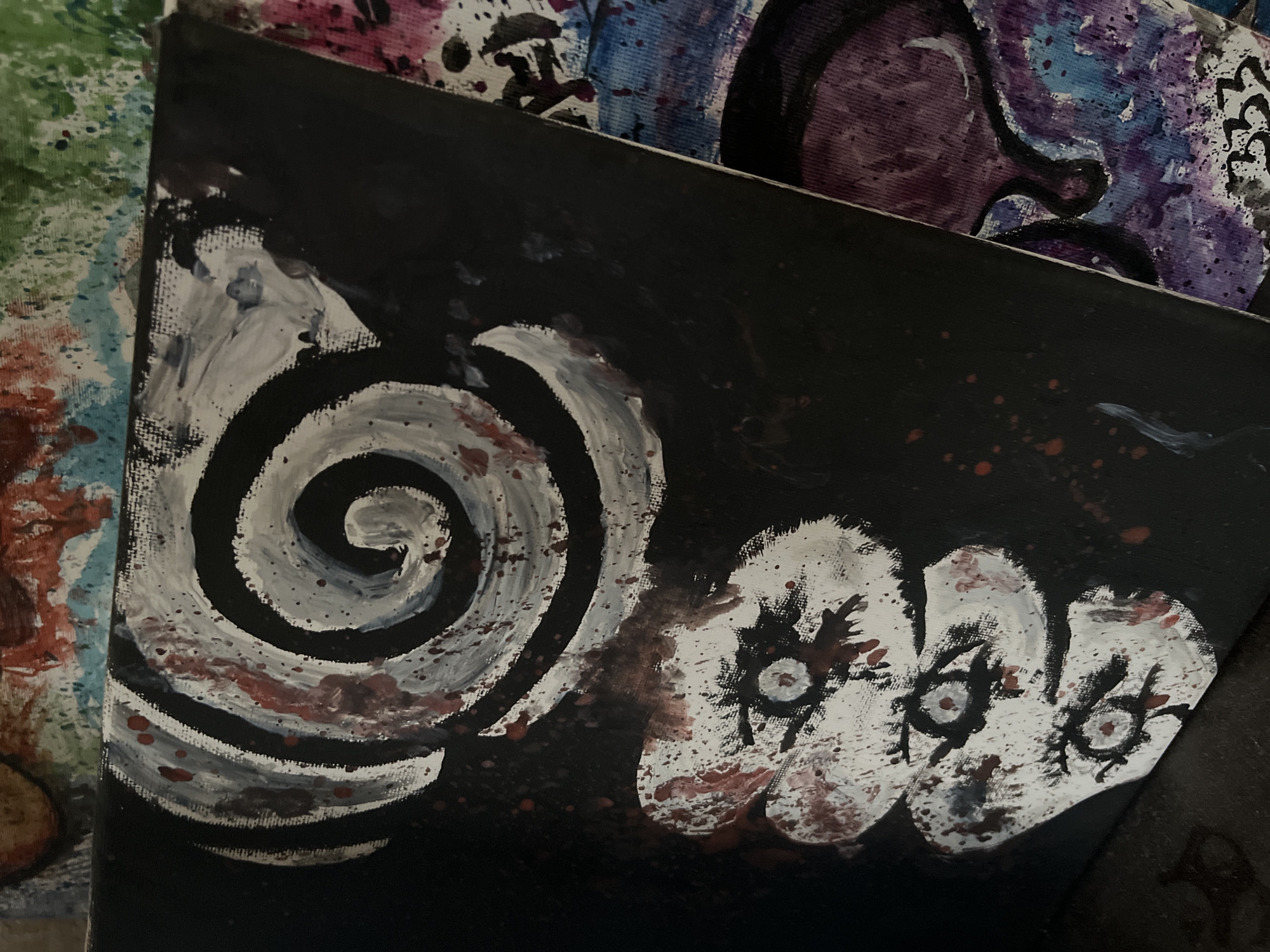 The image displays a close-up, angled view of an acrylic painting on canvas, positioned vertically. The primary canvas features a matte black background. In the upper half, a large, stylized white spiral occupies the upper-left quadrant, with irregular brushstrokes and noticeable red-brown splatters, along with subtle dark blue and grey pigments intermingled within the white. Below the spiral, aligned vertically in the lower-left, are three distinct, oval-shaped white forms, each depicting an eye with a dark pupil and iris. These eye forms also exhibit numerous red-brown splatters across their white surface, giving a distressed or blood-splattered appearance. The paint application on the main canvas reveals a textured surface. To the right and partially behind the main canvas, a second, abstract acrylic painting is visible. This background painting shows a chaotic blend of purple, blue, green, and pink hues with various black lines and shapes, and numerous small splatters of black and other colors. A section of this painting in the lower-right foreground displays three black digits, "333," painted against a lighter background. Further in the background, another painting with red, green, and white elements is partially visible above the main canvas. The paintings are resting on an unidentifiable dark, possibly textured, surface at the bottom of the frame. No individuals are present in the image. No actions or interactions are depicted. The scene is static, focusing on artwork. The specific location within the city of Sofia, Bulgaria, or any other geographical detail, cannot be determined from the visual information provided.