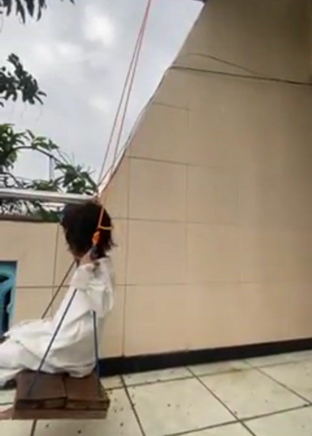 A young girl is shown sitting on a wooden swing on a tile patio. She is wearing a white outfit. The swing is suspended by orange and blue ropes attached to the building’s overhang. The sky is overcast. In the background is a cream-colored tiled building wall with a tree visible to the left. She is facing left and smiling. She appears to be singing.
