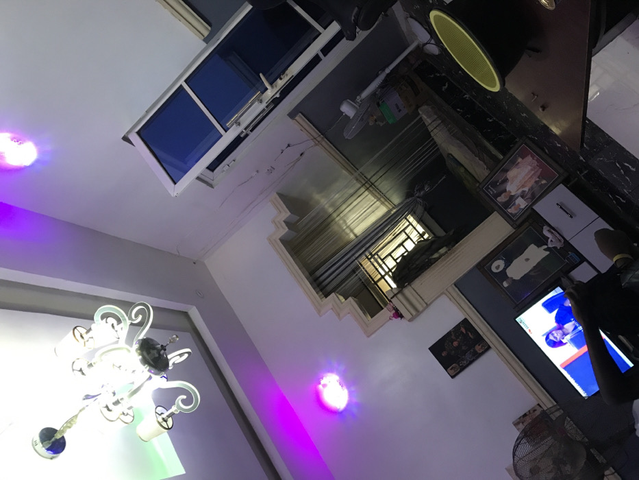 An off-angle view upwards shows a room with a chandelier, a skylight window, and interior windows. The room has a mix of lighting: natural from the skylight, artificial from the chandelier, and a purple spotlight. A television screen is visible along a wall adorned with framed pictures and a decorative ledge. A person is near the screen, partially visible. A ceiling fan and a black speaker are also in the view.