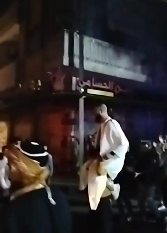 The video captures a street celebration at night. A man in a white robe is being carried on someone's shoulders, while a crowd surrounds them. People are drumming and clapping along to the music. The background features a building with Arabic script and a drawing on its facade. The lighting is dim, but there are some lit windows visible above the people.