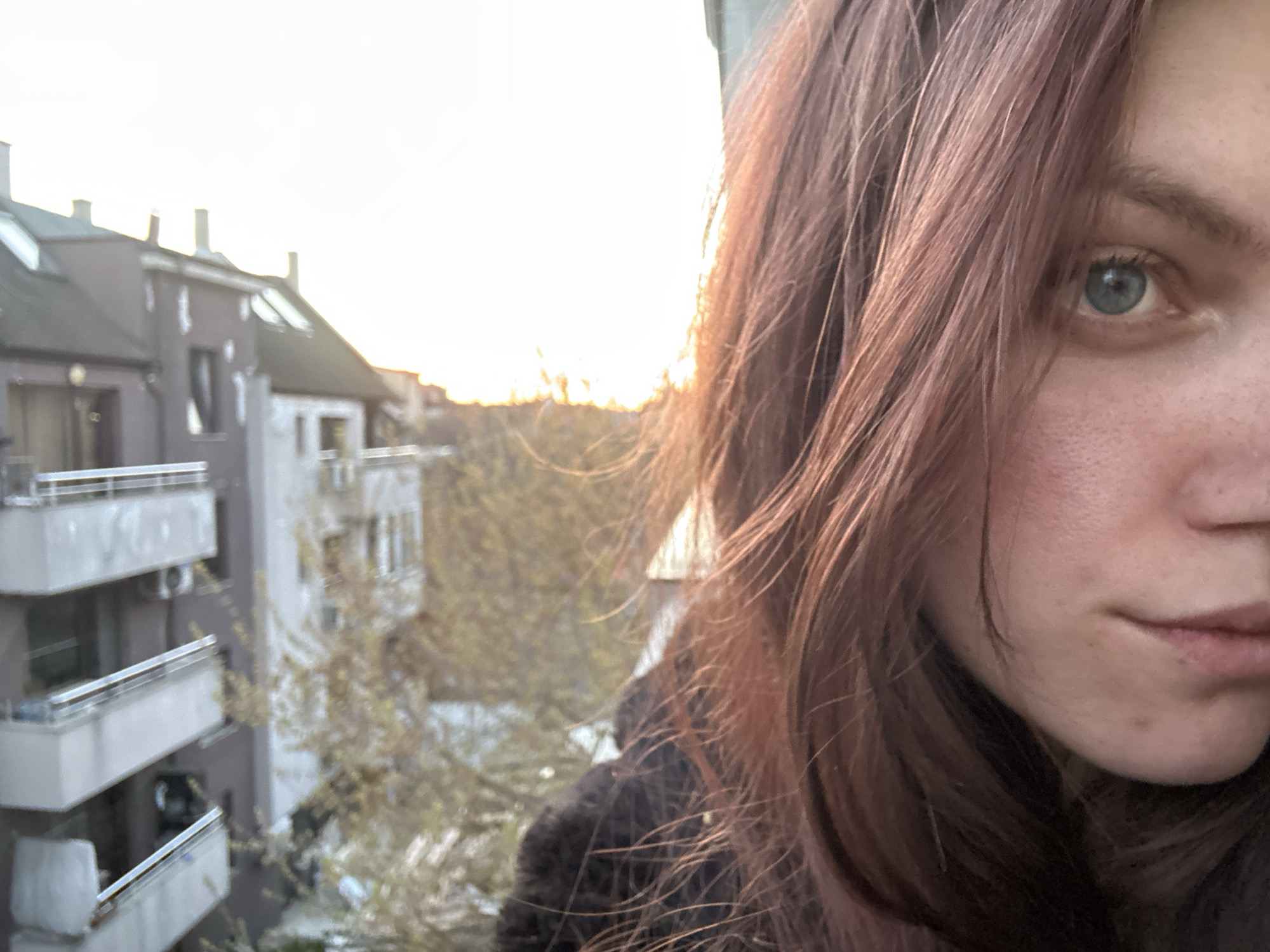 A selfie of a fair-skinned woman with auburn hair and light blue eyes. She is partially in the frame, with her right side dominating the shot. Behind her is an urban scene, visible through a window or balcony. Buildings are visible in the background, some with balconies. A tree with sparse foliage is also visible. The time of day appears to be near sunrise or sunset due to the warm lighting. Location cannot be verified as Varna, Bulgaria from the given image.
