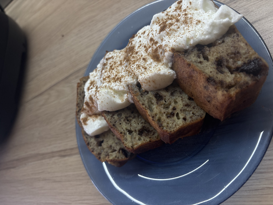 - "Four slices of banana bread, exhibiting visible dark inclusions consistent with chocolate chips, are arranged on a dark blue, glossy, circular plate" by FM-HD8jT2, licensed under CC BY 4.0