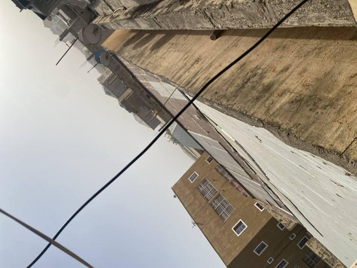 n urban scene with buildings and infrastructure. A tall brown building with multiple windows is visible in the lower center. Above, a long row of buildings recedes into the distance, with satellite dishes on rooftops. A concrete structure lines the top right, while power lines cross the frame diagonally. The sky is hazy, suggesting a polluted atmosphere.
