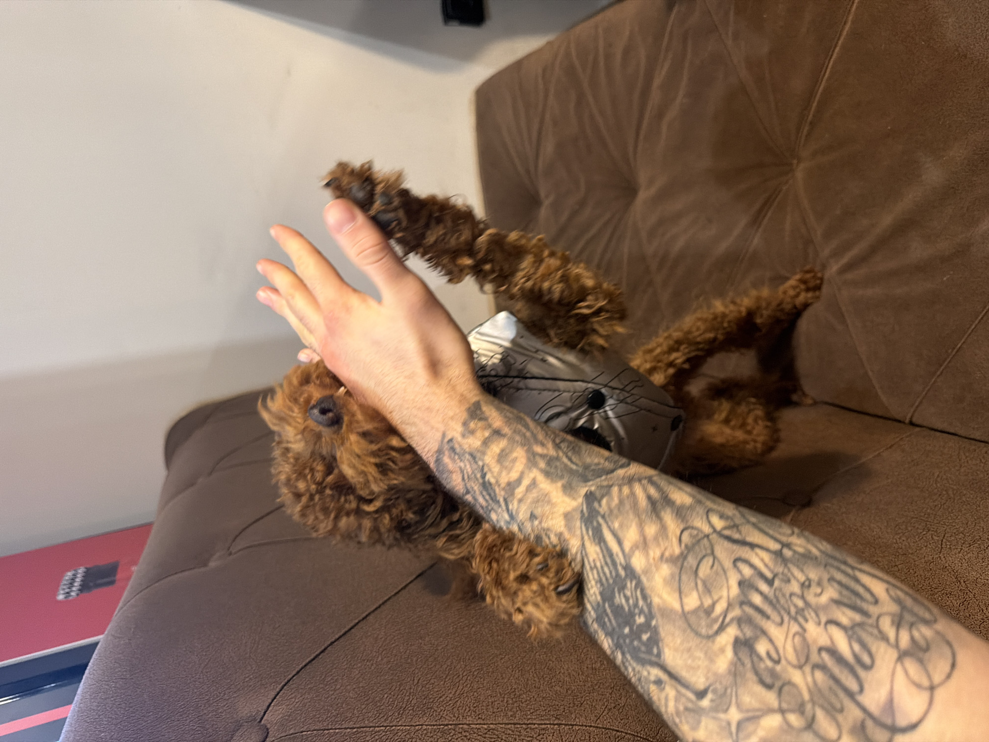 The image depicts an indoor scene featuring an interaction between a human's forearm and hand, and a small, reddish-brown, curly-haired dog. A human's left forearm and open hand, extensively covered in dark-ink tattoos featuring script and patterns, are positioned centrally. The dog, consistent with a poodle breed, stands with its front paws raised, one making contact with the human's open palm. The human's hand is held near the dog's snout, with the dog's nose and one eye visible. A light-colored harness with black irregular markings is visible on the dog. The subjects are situated on a brown upholstered furniture piece, likely a sofa, characterized by tufted back and seat cushions. In the upper left background, a partial red object, possibly a framed item with vertical black stripes and a white element, is visible against a light-colored wall. The environment is residential. There are no discernible visual cues within the image to indicate the specific location as Sofia, Bulgaria.