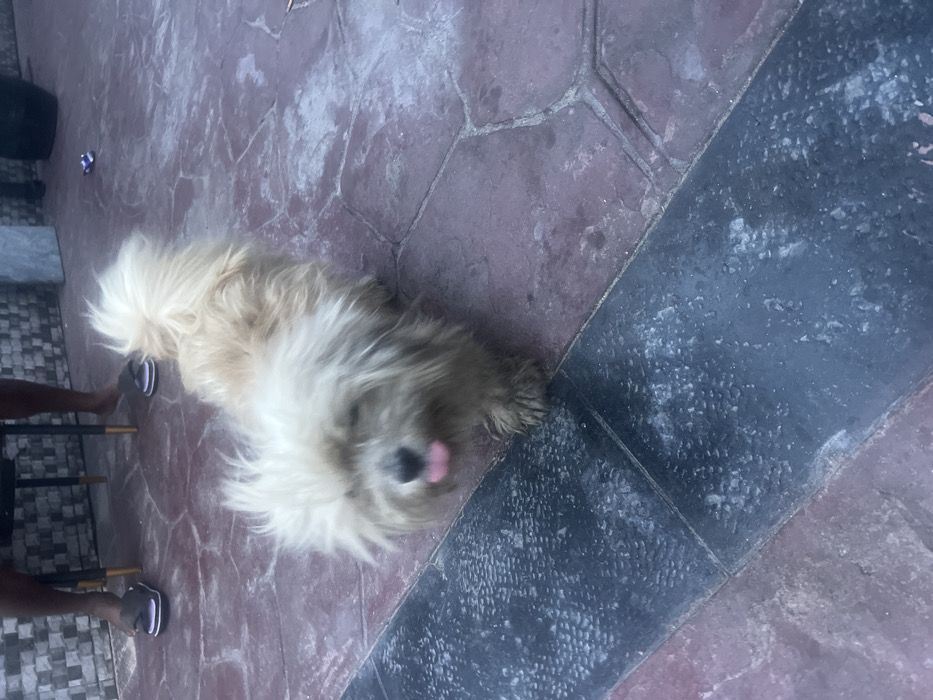 A medium-sized, light-colored, fluffy dog is lying on a patio