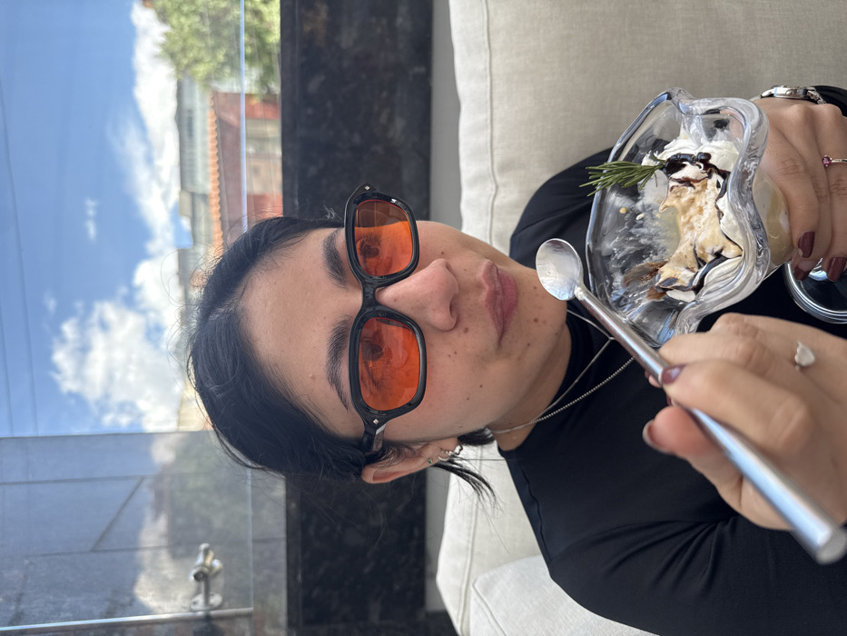 A woman with dark hair and dark-framed sunglasses with reddish-orange lenses is depicted from the chest up, engaged in eating a dessert. She wears a black long-sleeved top, a thin silver ball-chain necklace, and multiple silver earrings in her left ear. Her fingernails are painted a dark red, and she wears a light-colored heart-shaped ring on her right ring finger and a small red stone ring on her right pinky finger. She holds a long-handled silver spoon in her right hand, positioned over a clear glass dessert dish with a ruffled rim. The dish contains a partially eaten dessert featuring layers of light-colored cream or ice cream, dark brown syrup drizzle, and a sprig of fresh rosemary garnish. Her lips are slightly parted. She is seated on a light-colored upholstered cushion. The background shows a clear blue sky with white clouds, reflected in a large, dark, glossy surface. This reflective surface also displays reflections of urban buildings with orange terracotta roof tiles and some greenery, situated above a dark grey wall. The scene is located on an outdoor terrace or patio within the urban environment of Bogota, Colombia.
