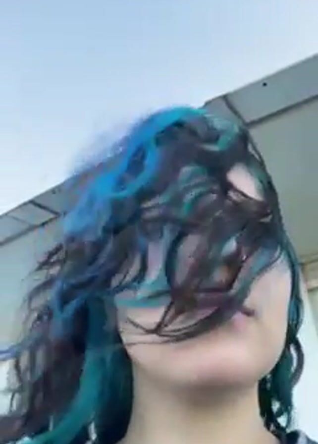 A young woman with curly dark hair and blue and teal highlights faces the camera in windy weather