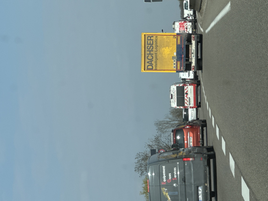 The scene depicts a daytime view of traffic congestion on a multi-lane motorway in Ostwald, France. Vehicles are observed in multiple lanes, either stationary or moving slowly. In the immediate foreground on the left, a dark grey commercial van with "Equipement Grues Services" and a crane logo on its side is visible, displaying a French license plate (EV-782-WP). Behind it, a red passenger car (DL-368-HS) is present. To the right, a white commercial van with "JUSSIEU Securite Environnement" branding and distinctive red and white chevron markings on its rear is visible (DM-273-JPS). Further ahead in the right lane, a yellow semi-trailer truck marked "DACHSER Intelligent Logistics" displays its rear (BM-809-KB) with speed limit indicators (60, 80, 90). Additional white vans, some also featuring red and white chevron markings, and other passenger vehicles are visible further down the road, indicating the extent of the traffic. The road features dashed white lane markings. On the left side of the motorway, beyond a barrier, bare trees and shrubs are visible under a clear, light blue sky. A partial view of a circular speed limit sign, showing "80," and a square solar panel structure on a pole are also present on the left shoulder. No individuals are discernibly visible outside of vehicles.