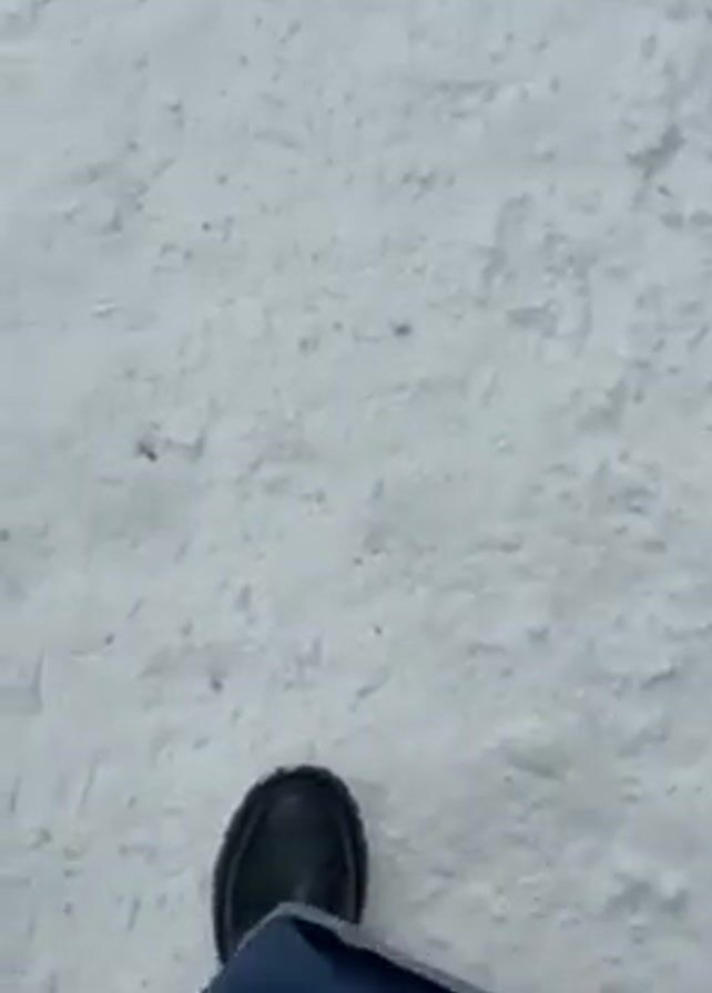 first-person view of a person walking on snow. The person is wearing dark boots and blue pants. The ground is covered in white snow with footprints visible.
