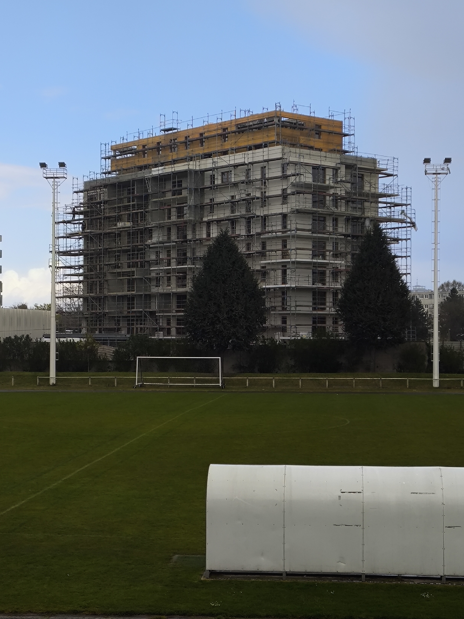 construction site in Schiltigheim, France. A multi-story building is under construction, covered in scaffolding. A soccer field is in the foreground, featuring goals and stadium lights. A white dugout is in the foreground. Three trees sit between the building and the fence. The sky is partly cloudy.