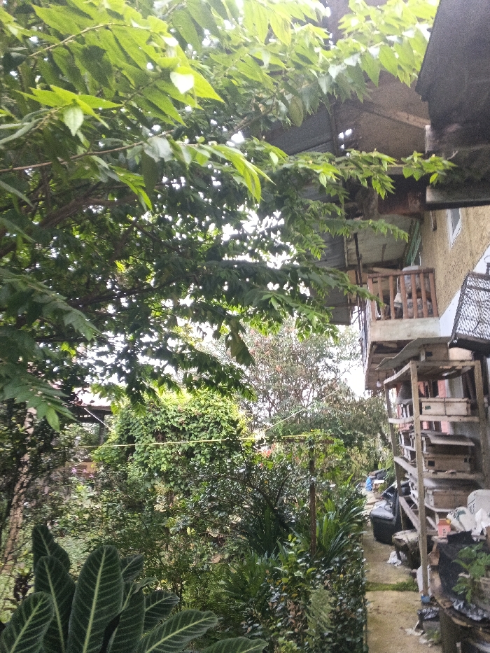 The image depicts an overgrown outdoor scene, likely a narrow passage or yard, adjacent to a residential structure in an unknown city in Vietnam. In the foreground and midground on the left, dense tropical vegetation dominates. Large, dark green, broad-leaved plants are visible at the bottom left, followed by a thick wall of various green bushes and smaller trees. Overhead, a dense canopy of light green leaves from a large tree filters the daylight. A thin, light-colored wire or string is stretched horizontally across the midground, partially obscured by the foliage. On the right side of the image, a light brown stucco or plaster building wall is visible. An upper-level balcony extends from the building, featuring a rustic wooden railing with turned balusters. Above the balcony, a dark, possibly corrugated metal, roof structure is partially visible. Below the balcony, a multi-tiered wooden shelving unit stands on the ground, holding numerous light-colored rectangular items, possibly boxes or crates, stacked vertically. Adjacent to the shelving unit, a dark object resembling a tire or large container is visible on the ground, along with other miscellaneous items and a small potted plant. A narrow, concrete or dirt path runs along the base of the building, separating it from the dense vegetation. No individuals are present in the scene, and no discernible actions or interactions are depicted. The lighting suggests daytime conditions, with diffused light filtering through the dense tree canopy.