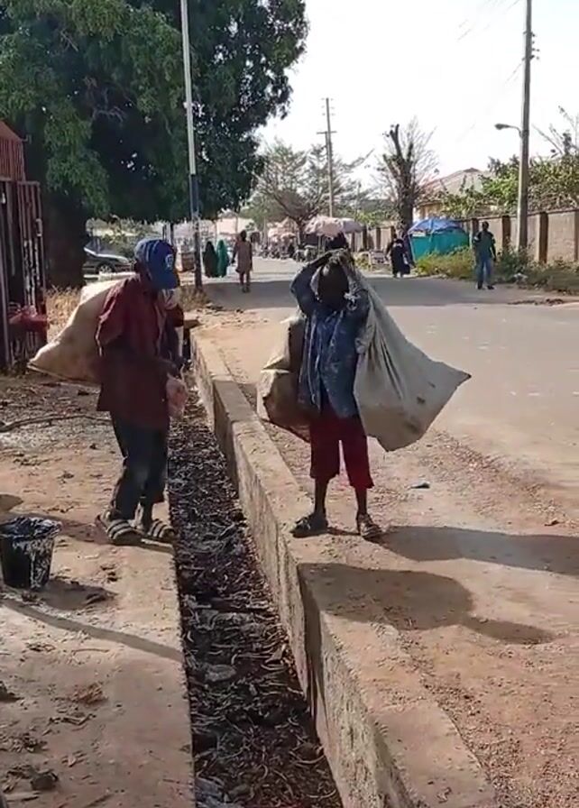 Two individuals are walking side-by-side down a street, each carrying a large sack slung over their shoulders. The person on the left is wearing a red shirt and a blue baseball cap, while the person on the right is wearing a blue shirt and red shorts. A motorcycle drives by on the street behind them. The scene appears to be outdoors in a dusty, somewhat urban environment. There is a concrete drainage ditch alongside the sidewalk where the two individuals are walking. Other people are walking on the street further in the distance.
