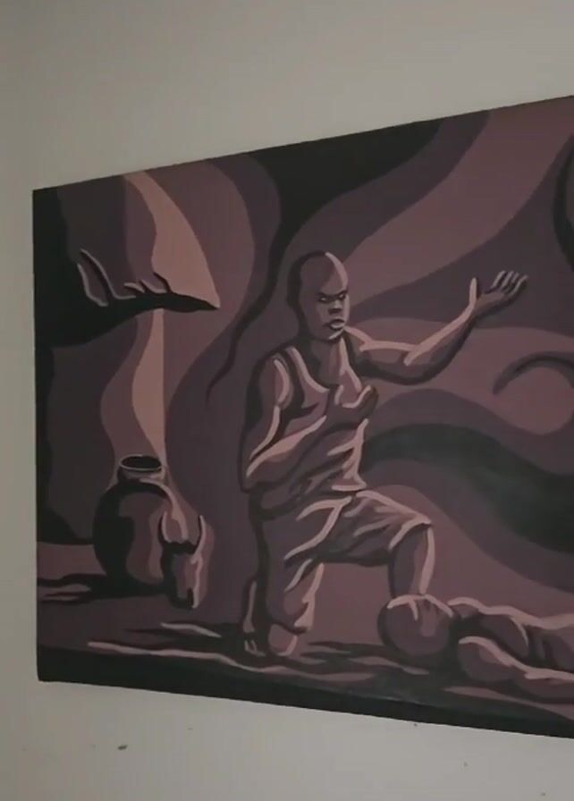 A painting hangs on a white wall. The painting depicts a person kneeling next to a prone figure. Behind them, there is an urn or vessel and swirling shapes of dark shades. A white circle is in the upper-right quadrant. The painting is composed of varying shades of brown.