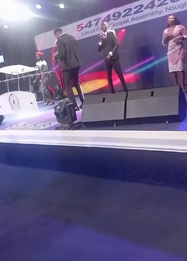 gospel performance inside a church. Three people stand on a brightly lit stage in front of a large screen that reads "5474922426 Life of Faith Gospel Assembly, Nsuc". The three people appear to be singing. To the left of the stage is a drum set and a platform with the church logo. To the left of the screen on a separate raised stage is a band including guitar, keyboard, and drums. The floor of the room is a dark blue color.