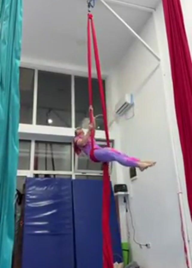 A woman in a pink and purple outfit is suspended from a long, red aerial silk hanging from the ceiling in what appears to be a dance or exercise studio