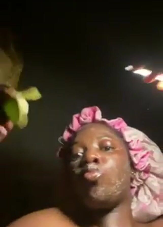The video features a dark-skinned person with a pink and white patterned hair bonnet, and a white substance on their face