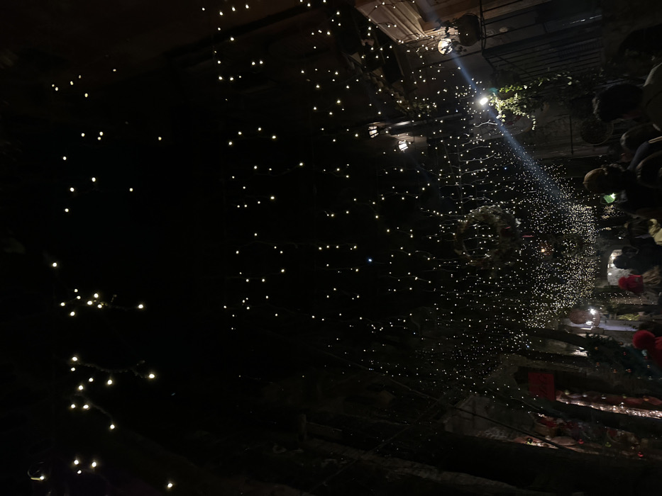 The image depicts a crowded nighttime scene in Santa Cruz Aquiahuac, Mexico, captured from a low-angle perspective looking forward and slightly upwards into a decorated outdoor pathway or street. Hundreds of small, warm-toned string lights are suspended overhead, creating a dense, illuminated canopy. The surrounding environment consists of dark, likely stone or brick buildings and walls on both sides, which are partially obscured by the darkness and additional decorative elements. On the left side, sparse greenery and what appear to be small Christmas trees or festive decorations are visible. On the right side, a traditional-style street lamp is mounted on a building, and a distinct, narrow beam of light cuts across the scene from the right mid-ground towards the center-left. A large group of people occupies the lower half of the frame, their backs mostly visible, suggesting movement through or gathering within the illuminated space. Individuals are indistinguishable beyond general silhouettes; one person wears a red beanie, and another a baseball cap. The overall lighting is dim, highlighting the string lights and specific illuminated areas.
