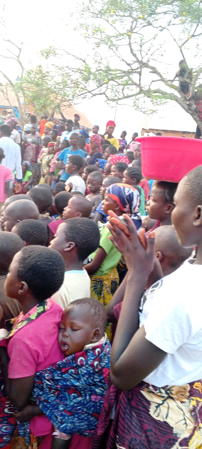 The image captures a densely packed outdoor gathering of individuals, predominantly children and women, in Fizi, Democratic Republic of the Congo