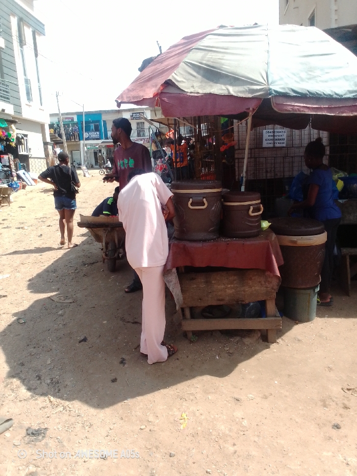 The image displays a street market scene in Awka, Nigeria, under bright daylight