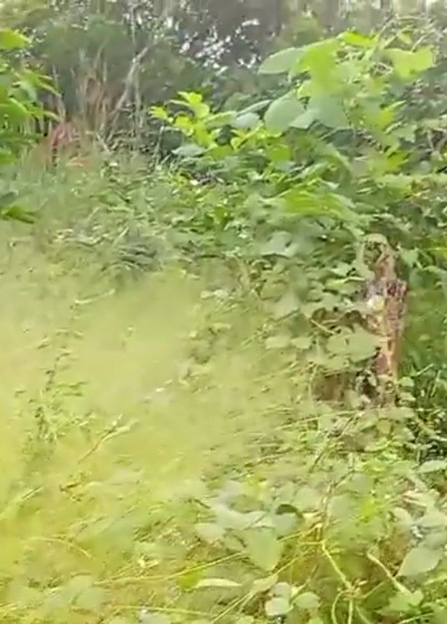 densely vegetated area. It features tall grass and assorted bushes and trees. Some trees are taller with bare trunks visible, while others are smaller and bushier. The overall impression is of a slightly overgrown or uncultivated landscape.