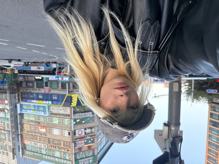 A woman with blonde hair and blue eyes is shown from a low angle. She's wearing a black leather jacket and a distressed baseball cap. The background features urban buildings with numerous signs, possibly in a non-English language. There's a bus or larger vehicle visible, suggesting an urban street scene. The overall impression is a casual, on-the-go moment captured. The image is rotated counter-clockwise.