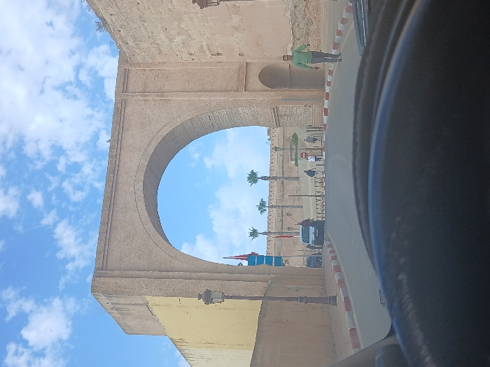 The image depicts a daytime street scene in Al Machouar – Stinia, Morocco, viewed from inside a vehicle, with the top portion of a black steering wheel visible in the foreground. A large, weathered light-brown stone archway, a historical city gate, dominates the center of the frame, spanning across the street. This archway is flanked by continuous stone city walls; the wall to the left features a section with yellow paint, while the wall to the right shows significant weathering and includes a smaller, secondary arched opening. The sky above is bright blue with scattered white cumulus clouds. Two traditional black street lamps are positioned on either side of the main archway, with the left one fully visible and the right one partially obscured by the frame edge. Beyond the archway and walls, several tall palm trees are visible. An asphalt road, bordered by red and white painted curbs, leads through the archway and curves slightly to the left. On the left side of the road beyond the arch, a white Peugeot van is stationary near a barrier. A red flag is partially visible to the left of the van. Multiple individuals are present: a man in a light green long-sleeved shirt and dark pants walks towards the viewer on the right side of the road, having just passed the arch. Further down the street, beyond the van and near additional road barriers, at least three other people are seen walking or standing. The overall scene suggests a public thoroughfare in a historical urban setting under clear weather conditions.