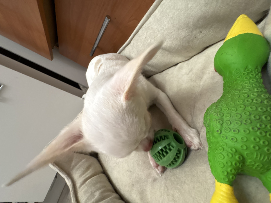 A white dog rests on a light-colored bed, its head near a small, round, green toy. Next to the toy is a larger, green and yellow rubber duck. The dog's tail is visible, extending to the left. In the background are light brown and white cabinets. The dog appears relaxed, possibly playing with or resting near its toys.