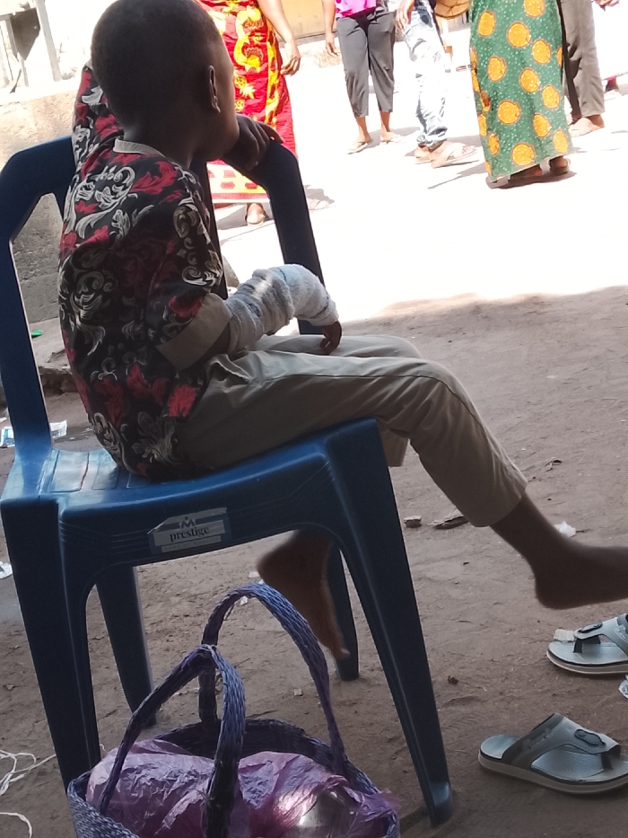 An outdoor scene in Wukari, Nigeria, depicts a young individual seated on a blue plastic chair in the foreground, facing right and looking away from the camera. The individual wears a black shirt with red and beige floral patterns, beige trousers, and is barefoot. A thick white bandage wraps around their right forearm and wrist. Beneath the chair, a woven purplish-blue bag containing a purple plastic bag rests on the dirt ground. Several other individuals are partially visible standing in the sunlit background, including one person in a red and yellow patterned garment, another in dark trousers and a pink top, one in blue jeans, another in a green garment with yellow polka dots, and a person in brown trousers. The ground is unpaved dirt with scattered light debris. The chair bears a "M Prestige" logo on its backrest.