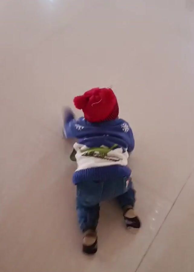 A child, seen from behind, is crawling across a tiled floor. The child wears a blue sweater with a white section featuring a green reptile graphic, blue jeans, and brown shoes with a dark accent. They also wear a red knit hat, slightly askew. The tiles on the floor are light-colored.