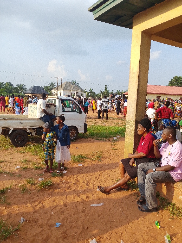 A gathering outdoors shows two children in front of a white truck with a man sitting on it. Two adults sit on a low structure on the right. In the background, a crowd of people stands near buildings under a cloudy sky. The ground is mostly dirt with some patches of grass, and bits of trash scattered around.