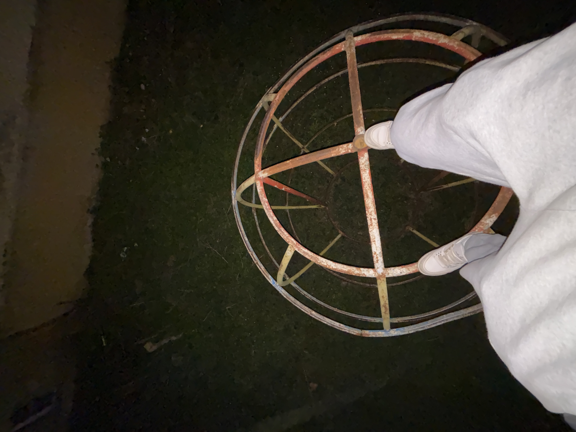 An overhead shot shows a rusty metal playground climbing structure on grass. A person wearing grey sweatpants and white sneakers is standing on the structure. The location is not apparent from the image.