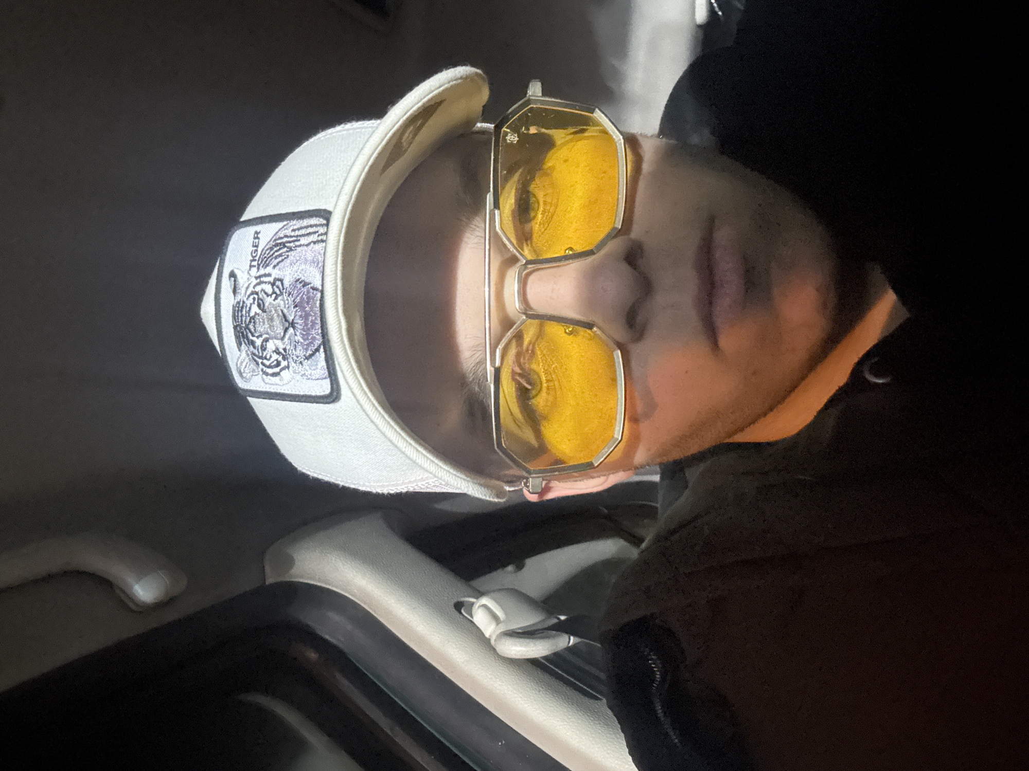 A person wearing yellow-tinted, geometric sunglasses and a white baseball cap adorned with a tiger patch is photographed from an unusual angle, presumably inside a car