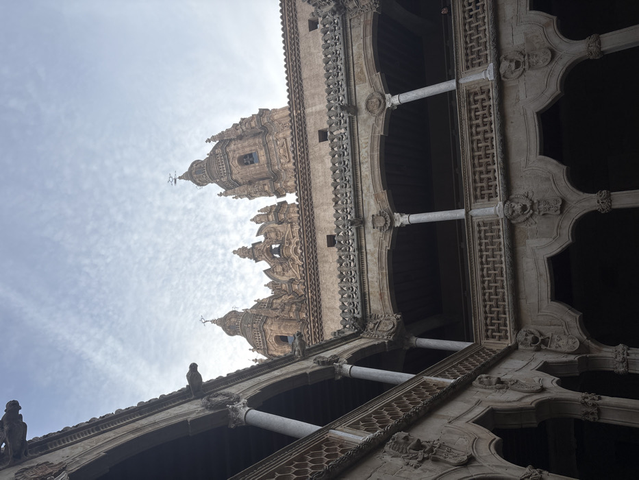 - "The image presents an upward view from a stone cloister or courtyard within the Pontifical University of Salamanca (La Clerecía) in Salamanca, Spain, directly facing the building's ornate bell towers" by FM-Y5o3W2, licensed under CC BY 4.0