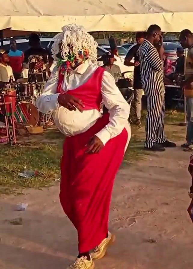 person in a colorful masquerade costume dancing outside in front of a live band. The person is wearing a white shirt with a red vest, red pants, white sneakers, and a white wig-like mask with colorful adornments around the face. The person is dancing with a rhythmic sway of the body. Behind the dancer is a band under a white tent. The band includes musicians playing drums, guitars, and keyboards. Several people are seated and watching the performance. In the foreground, another person in a plaid shirt is walking past the dancing masquerade. The ground is dirt with some patches of grass. The sky is visible with sunlight suggesting it is daytime.