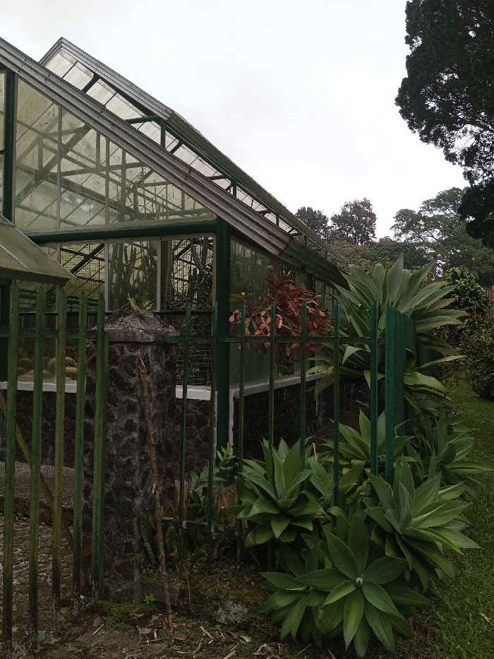 A greenhouse with a glass roof and green metal framing stands behind a dark stone pillar and a green metal fence. Various plants, including large agave plants, grow along the fence line. Red flowers are seen inside the greenhouse. Tall trees are in the background under a cloudy sky. The ground is covered with grass and some bare patches.