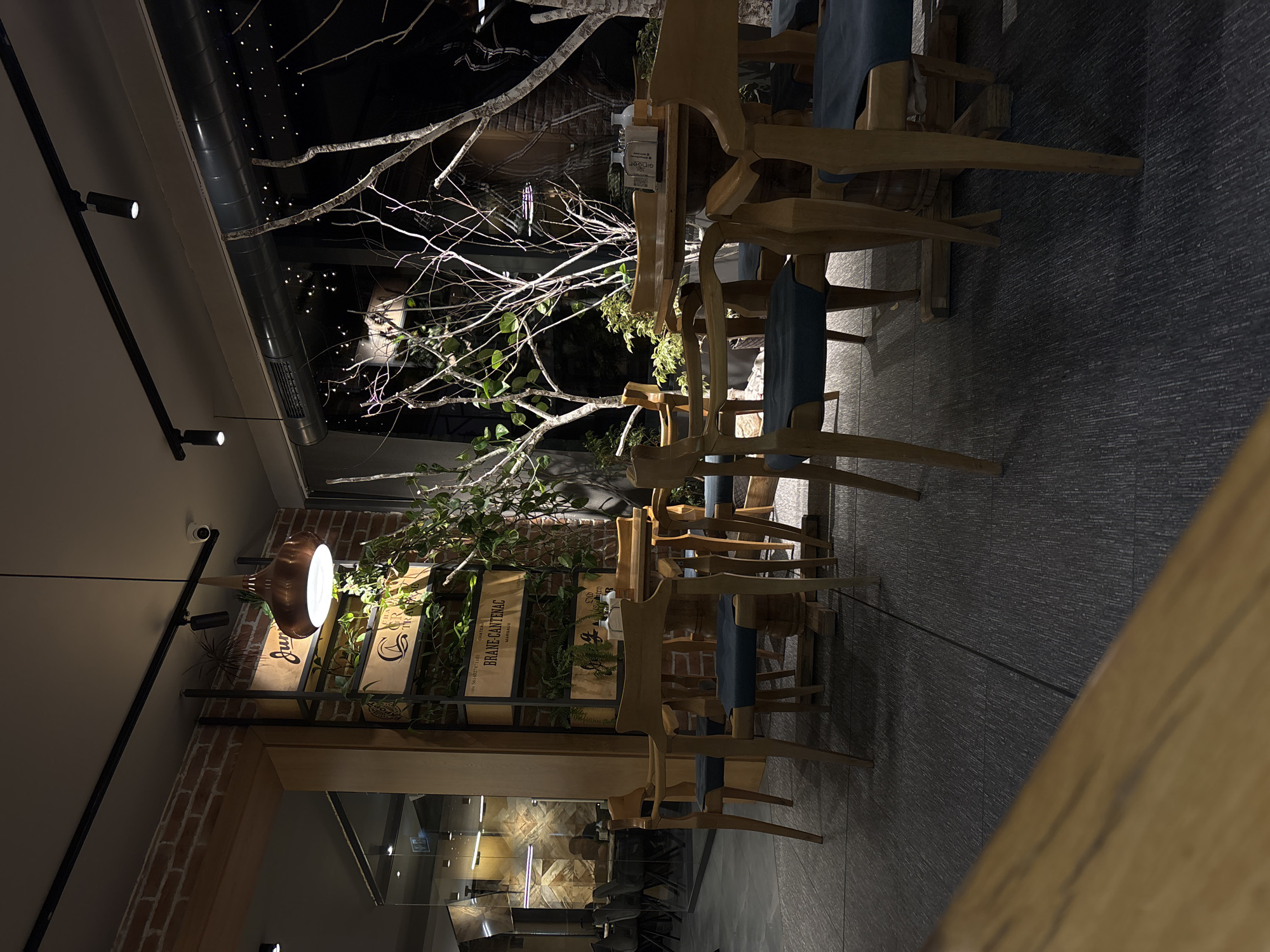 The image captures an interior scene in Bansko, Bulgaria. Several wooden chairs with blue cushions are stacked or arranged around tables, suggesting a restaurant or cafe setting. Decorative branches and greenery intertwine with the furniture. In the background, through a window or opening, lights are visible, indicating an outdoor or street view at night. A copper-colored lamp with a track lighting system is mounted on the ceiling. The floor appears to be covered with a dark grey carpet or tiles. Elements like "BRAINE-CANTEBAC" printed on wooden boxes add a decorative touch. The overall atmosphere is dimly lit, creating a warm, intimate setting.