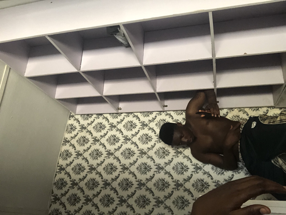 An indoor scene in Ogbomosho, Nigeria, depicts a male figure and a shelving unit. The shirtless male, with dark skin and short dark hair, stands partially obscured on the left, looking downwards. He wears dark athletic pants with a light-colored stripe. His right hand holds a dark smartphone, which emits an orange-yellow glow from its screen. Partially visible in the lower left foreground is a dark-skinned arm and hand belonging to another individual. The background features a wall covered in black and white damask-patterned wallpaper. To the right, a tall, light-colored shelving unit with multiple empty rectangular compartments is present. One upper-right compartment contains a folded, striped fabric item. The ceiling is light-colored. Illumination in the space appears dim.