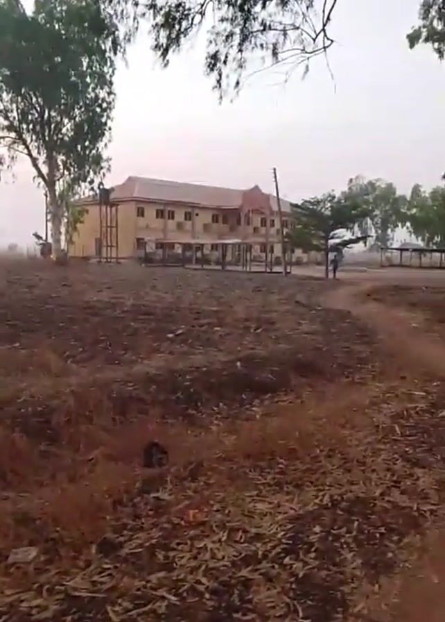 dirt path leading towards a two-story building. The path is reddish-brown, and the ground around it is covered in dry leaves and debris. To the sides of the path are trees, some with white trunks. In the distance, the building is visible, with a light-colored facade and a red roof. People can be seen walking near the building. The sky is overcast and a hazy. The overall scene has a somewhat desolate or rural feel.