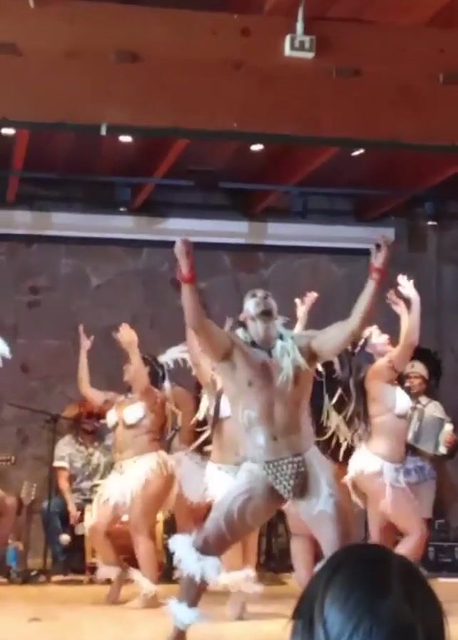 group of performers on a stage, engaged in a lively cultural dance. The central figure is a muscular man, partially nude with intricate body paint, a loincloth, and feathered accessories. He's surrounded by other dancers, both male and female, similarly adorned in traditional attire with feathered headdresses and white, fringed garments. Their movements are energetic and synchronized. Behind the dancers, a band plays music, featuring instruments like a drum, guitar, and accordion. The stage is set against a backdrop of stone walls and a wooden ceiling with recessed lighting. In the foreground, the back of a person's head is visible, suggesting the performance is being watched by an audience. The overall atmosphere is vibrant and celebratory, showcasing a cultural performance.