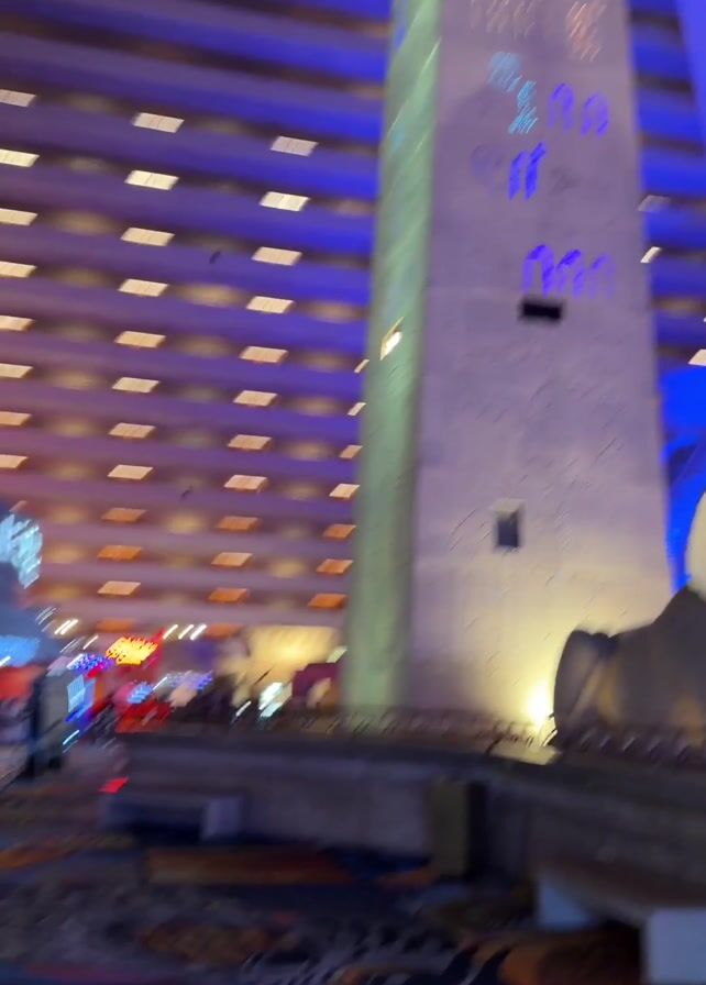 Inside a building that appears to be the Luxor Hotel in Las Vegas, an obelisk and a statue of a Sphinx are prominent in the interior space
