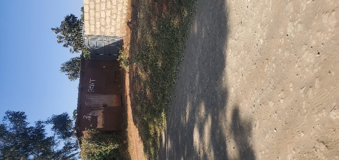 A sideways view shows a rusty metal gate with "RENT" written on it next to a brick wall. Foliage grows along the wall and gate. A concrete road occupies the foreground, with shadows cast across it. The sky is clear and blue. Trees are visible on the left side of the image.