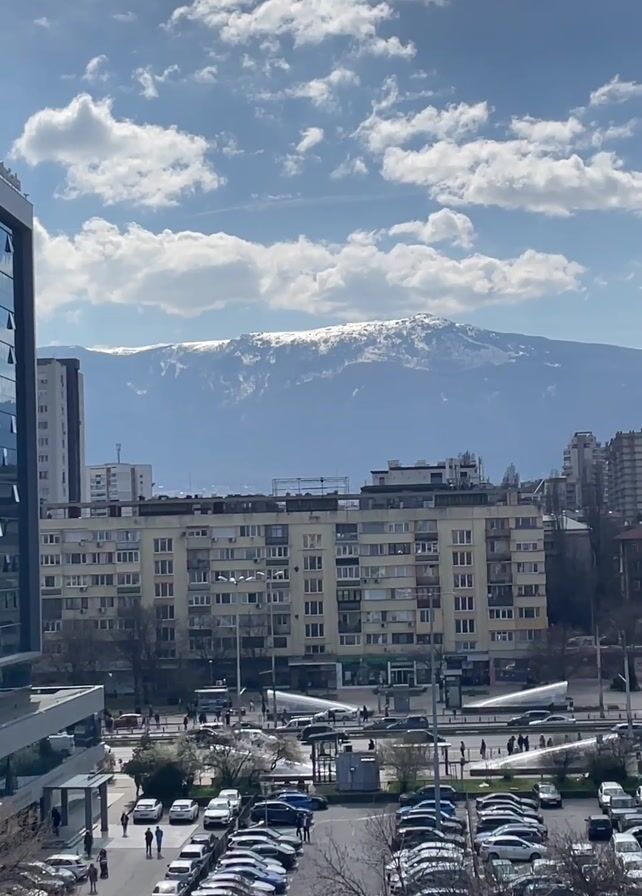 The scene is a city view under a blue sky with scattered clouds. A mountain with visible snow on its peak is in the background. In the foreground, a modern glass-fronted building stands to the left of the frame. Beside it is a parking lot filled with numerous cars. People are seen walking across a crosswalk and along the sidewalk. The middle ground shows apartment buildings and other urban structures. The overall environment suggests an urban setting on a bright day.