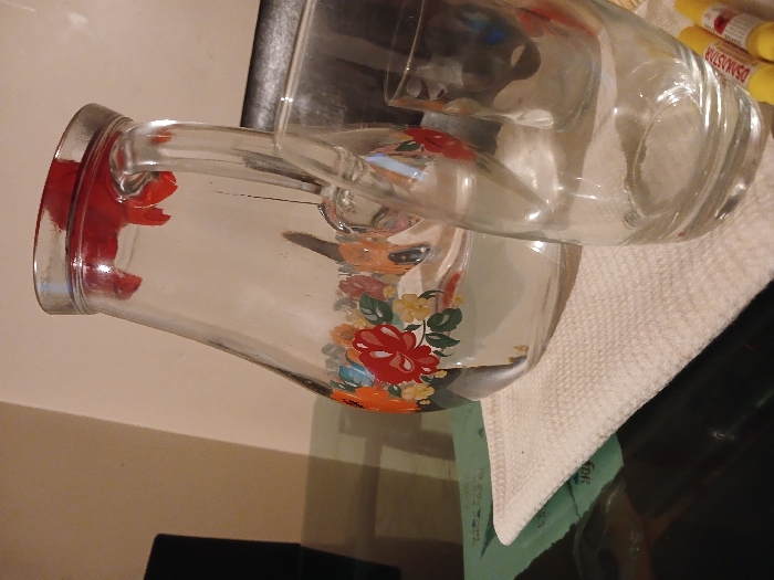 Two glass pitchers sit next to each other on a white towel. The pitcher closer to the camera has a red handle and rim, with painted flowers decorating the side. The second pitcher sits above and angled towards the first, partially inside. The towel is next to a black surface, with yellow and orange art supplies near the top right corner of the image.