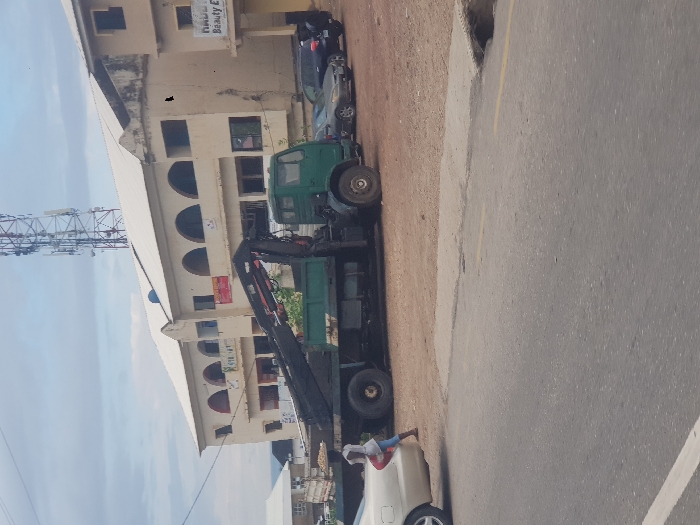This image depicts a daytime street scene in Lokoja, Nigeria, under an overcast sky. In the foreground, an asphalt road with a faded yellow line transitions to an unpaved dirt and gravel area via a concrete curb and drainage channel. A large, dark green flatbed truck, equipped with a black hydraulic knuckle boom crane, is centrally parked on the unpaved surface; its bed holds light-colored material. Adjacent to the truck and closer to the background building, a dark-colored SUV and a light-colored sedan are parked. The background features a two-story, cream-colored commercial building with a white sloped roof and multiple arched windows on the upper level. Portions of a sign reading 'HADIZA Beauty' are visible on the building's right section. Directly behind the building, a tall communications mast with antenna arrays is visible. On the far left, a silver sedan is partially visible on the paved road. A person, viewed from behind, wearing a light-colored top and a red lower garment, stands at the rear driver's side of this silver sedan, appearing to be engaged with the vehicle or its immediate vicinity.