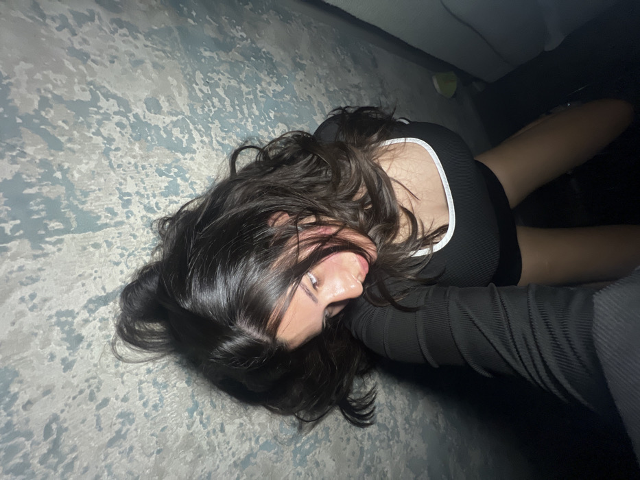 The scene depicts an individual located indoors in Kiryat Bialik, Israel. A person with long, dark hair is lying on their back on a light-colored carpet featuring a mottled pattern of grey, white, and light blue. The person is wearing a black top with white trim and black shorts. Their face is angled upwards, with eyes open. Their legs are bent at the knees and raised, partially obscured by darkness above. A ribbed black fabric, possibly from another garment or object, is visible near the person's right side. To the left, a portion of a light-colored upholstered furniture item, possibly a sofa, is present. A small, light green object is visible on the floor near the upholstered furniture. The immediate background above the person's legs is dark.