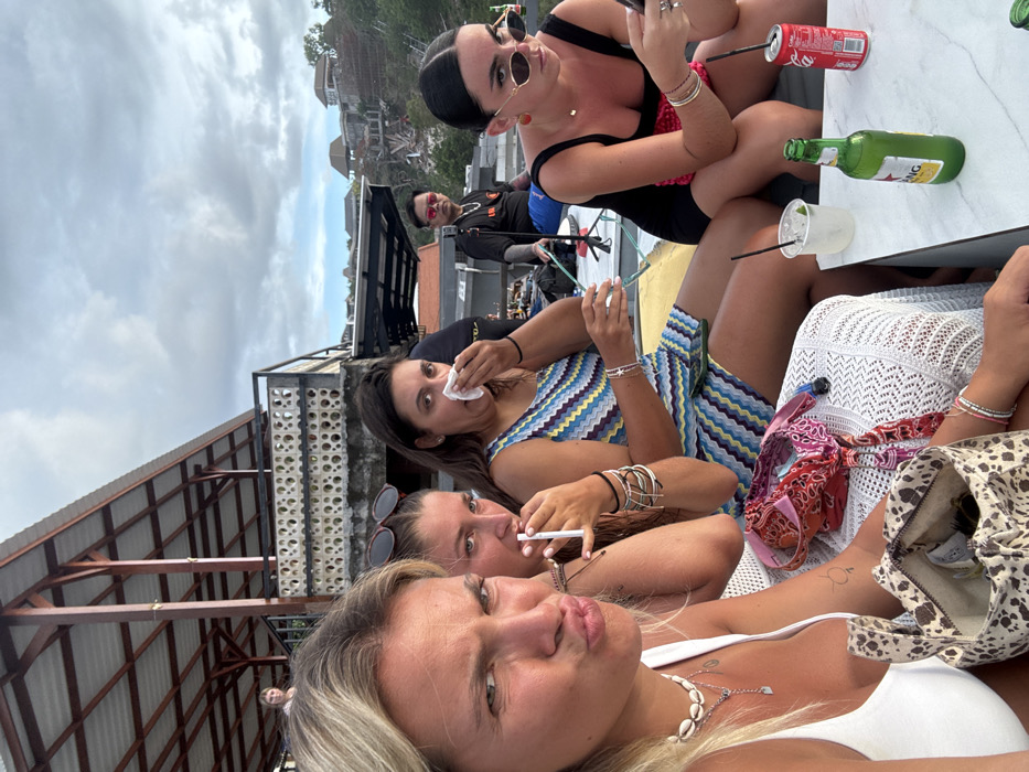 The image depicts five women and one man at an elevated outdoor dining or bar area in Uluwatu, Indonesia, under an overcast sky