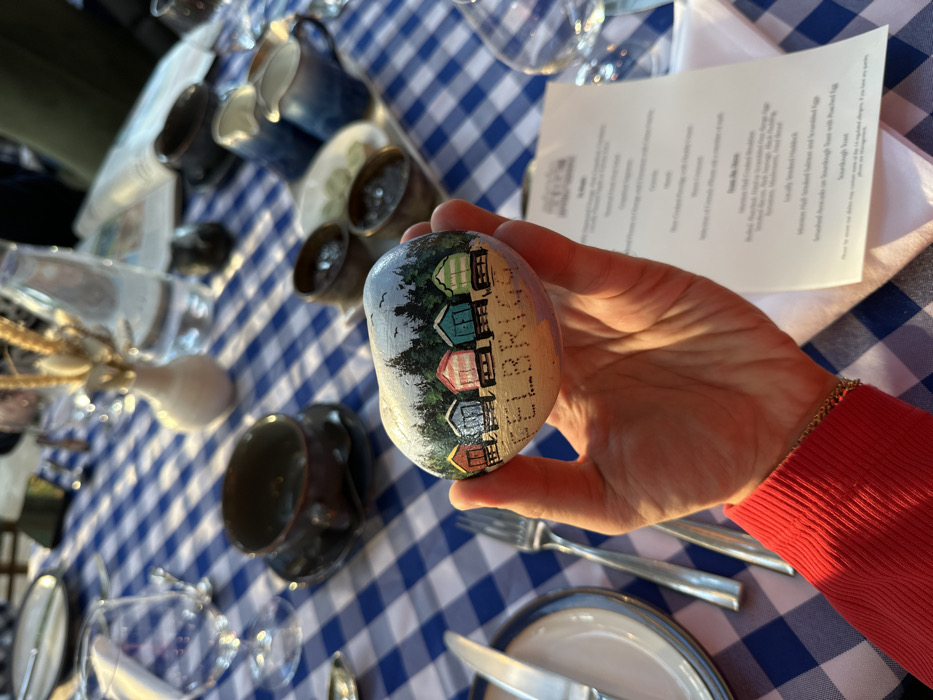 A person's left hand, wearing a red long-sleeved garment and a delicate bracelet, holds a smooth, painted rock in the foreground. The rock depicts a beach scene with a strip of sand, five colorful beach huts (red, blue, pink, teal, green) on stilts, a line of dark green trees, and a light blue sky with three bird silhouettes. The word "FELBRIGG" is painted in black letters below the beach huts. The scene is set on a dining table covered with a blue and white checkered tablecloth, indicating a restaurant or dining establishment. Various table settings are present, including a white plate with a dark rim, a knife, and a fork to the left of the hand. Further back on the table, out of focus, are clear glasses, dark ceramic cups and saucers, a small white vase with dried plant material, a clear glass water bottle, a small tray with additional dark mugs, and two blue and white ceramic creamers. A white paper menu listing breakfast or brunch items such as "Porridge" and "Smoked Haddock" is visible on the right. The lighting is warm and directional, suggesting natural light from a window or an overhead lamp. The location is implied to be in or near Felbrigg, North Norfolk, United Kingdom, as indicated by the inscription on the rock.