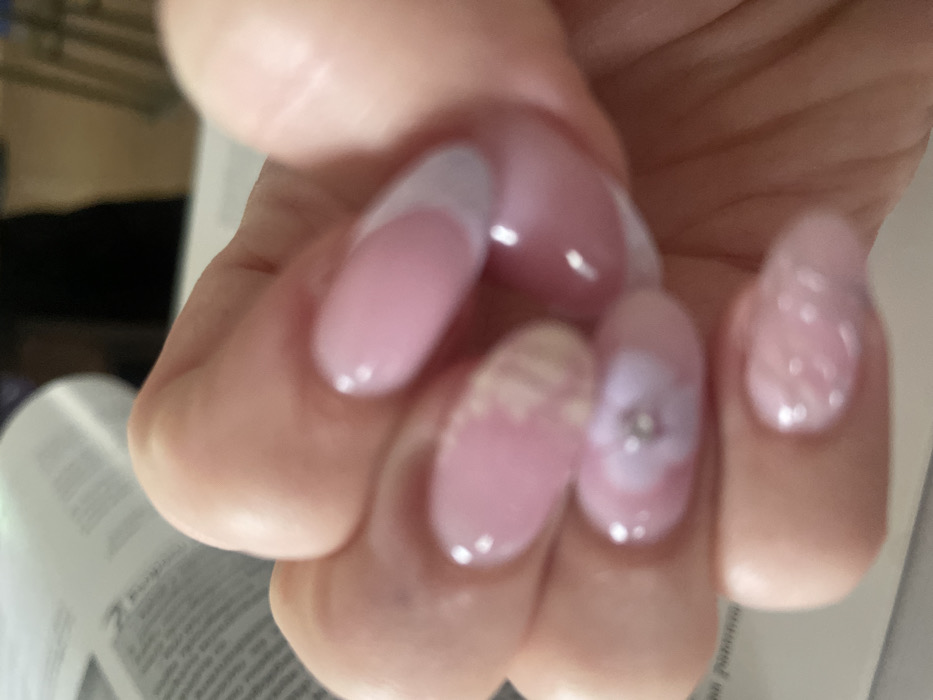 The image displays a close-up of a human hand, presenting five manicured fingernails. Each nail is oval-shaped and features a glossy, light pink base with distinct white tips, consistent with a French manicure style. The nail on the fourth digit (ring finger) is adorned with a white floral design that incorporates a small, spherical silver stud at its center. The nail on the third digit (middle finger) shows evidence of wear, with the white tip partially detached or chipped, revealing a lighter layer beneath. The hand is positioned over or adjacent to an open, blurred book or magazine, where indistinct black text is visible on white pages. The background is out of focus, indicating an indoor environment with ambient illumination. No discernible visual cues within the image allow for the identification of a specific location in Panagyurishte, Bulgaria.