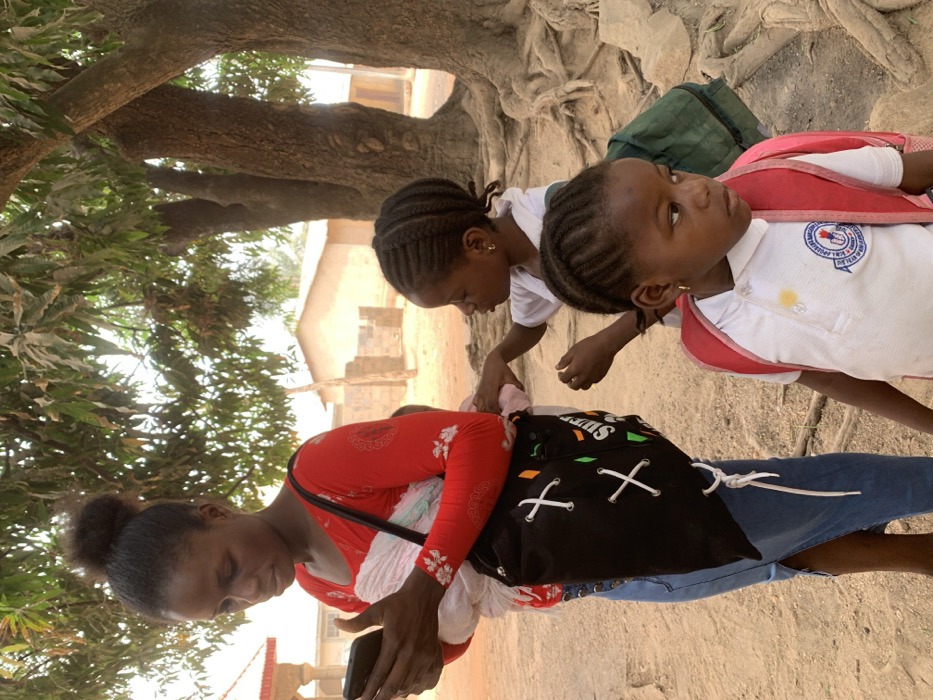 An outdoor scene in Garaku, Nigeria, depicts three individuals on dry, unpaved ground under several large trees with visible roots. A young adult female with dark hair in a bun wears a red long-sleeved top with a pattern and a blue long skirt, focusing on a black smartphone held in both hands. A white fabric, possibly a baby wrap, is draped across her chest, and a black shoulder bag with white 'X' patterns and colorful text hangs from her left side. To her right, a young female child with braided hair and a white top extends her right hand towards the adult female's side. A dark green backpack is partially visible on this child's back. In the foreground and slightly to the right, a second young female child, also with braided hair, wears a white polo shirt with a blue and red school emblem on the left chest and a red backpack, looking towards the right side of the frame. A yellow stain is visible on her upper right chest. In the background, various single-story buildings with light-colored walls and different roof types are present.