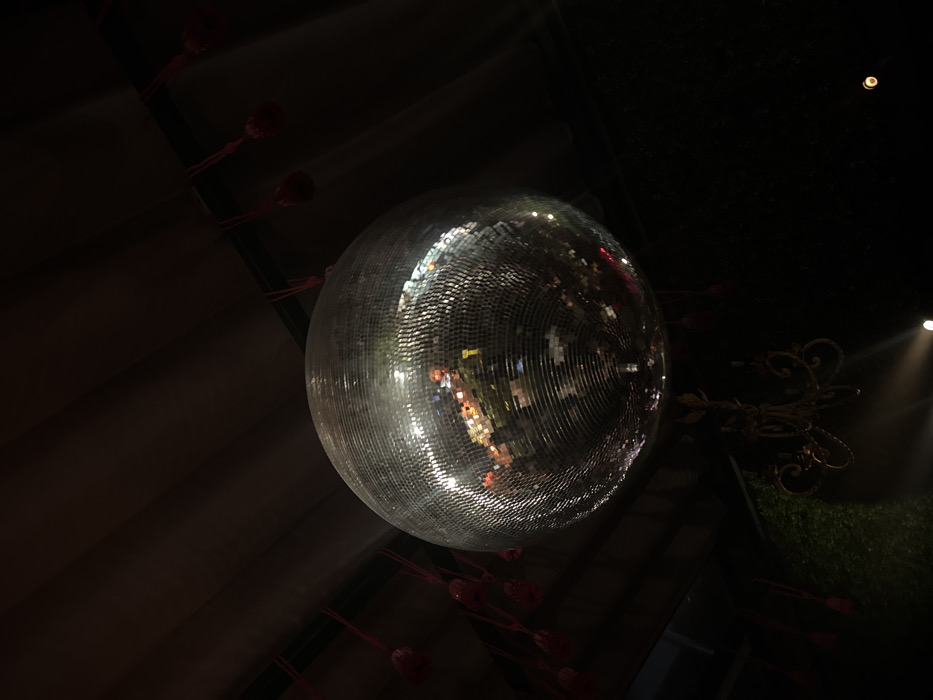 The image displays a large, spherical disco ball suspended from a dark overhead structure in what appears to be an indoor or covered outdoor entertainment venue